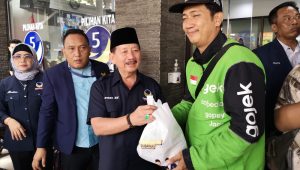 Foto : ketua DPW partai NasDem Provinsi Lampung, Herman HN saat membagikan paket sembako ke salah satu driver ojek online